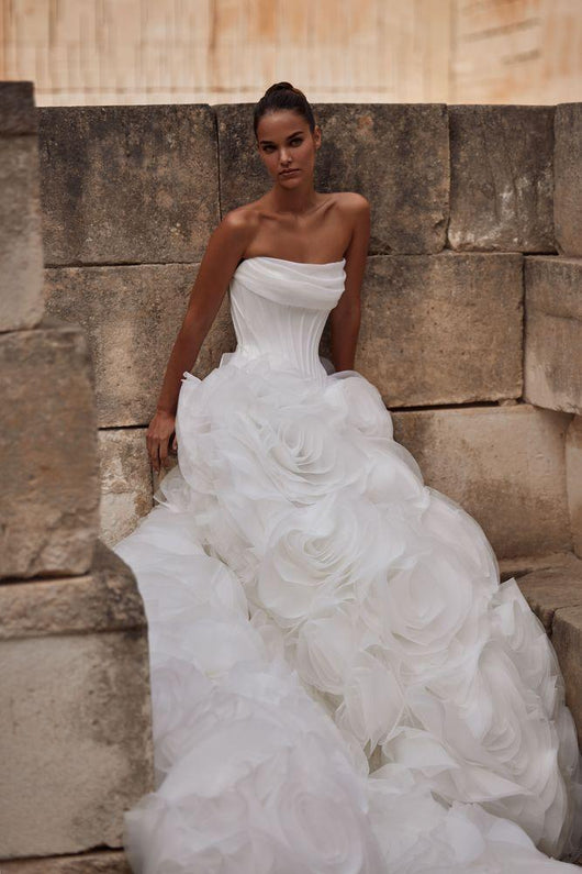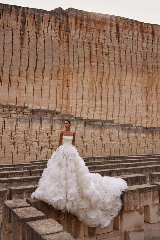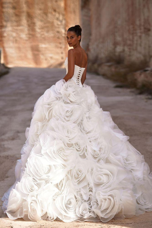 Confectionnée avec soin avec un corset bustier en arête de poisson et délicatement ornée de fleurs en organza, notre robe de mariée respire l'élégance et le romantisme. Sa silhouette ajustée offre une coupe flatteuse, tandis que les détails floraux ajoutent une touche de fantaisie. Parfaite pour un mariage de rêve et romantique.