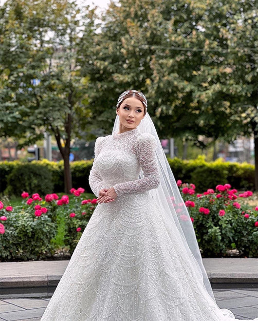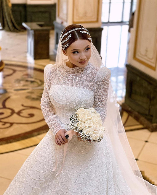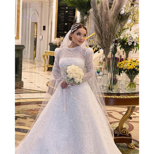 Cette robe de mariée perlée à manches longues est parfaite pour la mariée moderne. Réalisée avec des perles raffinées et un design intemporel, elle respire l'élégance et la sophistication. Ses manches longues offrent une couverture complète tout en laissant libre cours à vos mouvements, ce qui en fait le choix idéal pour toutes les occasions. Sublimez votre grand jour avec cette robe sublime.