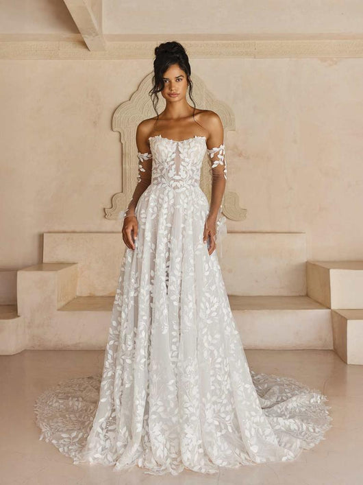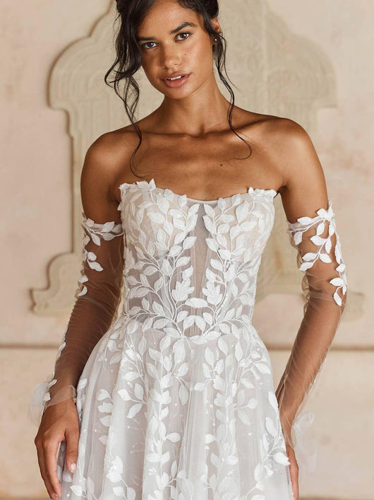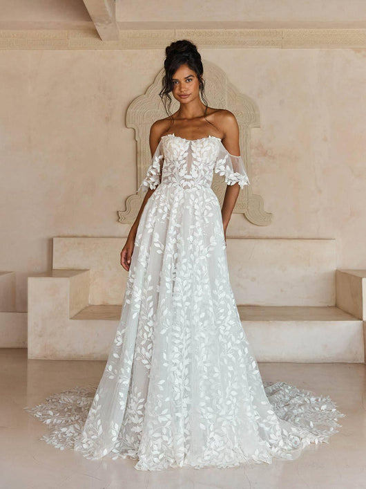 Cette robe de mariée à épaules dénudées et appliqués est un choix exceptionnel pour toute mariée. Ses appliqués complexes ajoutent une touche d'élégance et son design à épaules dénudées offre un look moderne et flatteur. Confectionnée dans un tissu de haute qualité, cette robe est à la fois confortable et sophistiquée, parfaite pour votre grand jour.