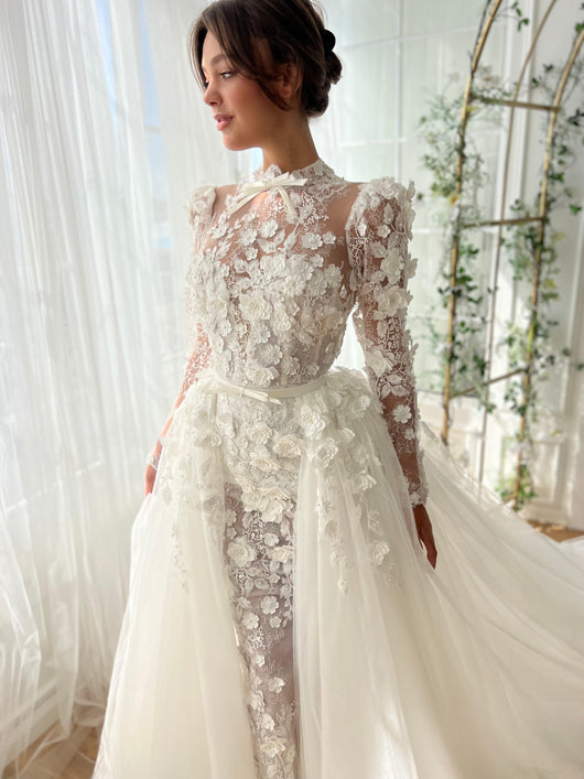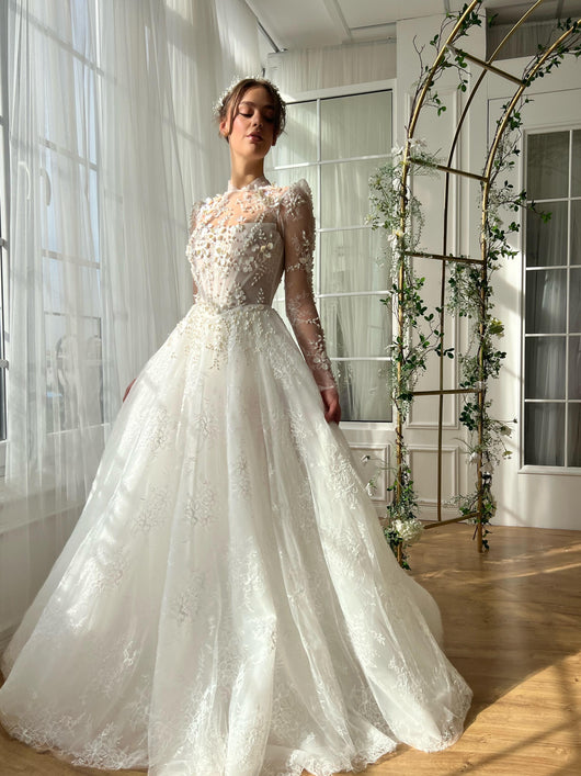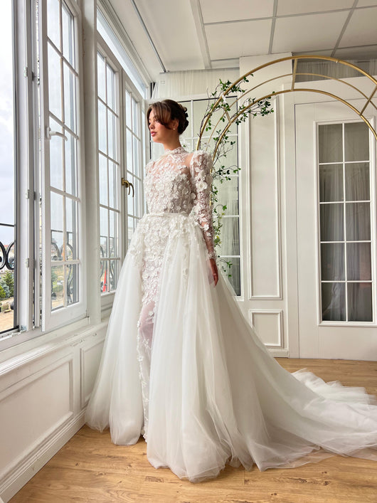 Cette élégante robe à manches longues ornée d'appliques est le choix idéal pour une robe de mariée. Avec ses délicates appliques et ses manches longues, elle respire la sophistication et le charme. Les manches longues offrent une allure à la fois sobre et élégante, tandis que les appliques ajoutent une touche de romantisme à l'ensemble. Affirmez votre style pour ce jour si spécial avec cette magnifique robe.
