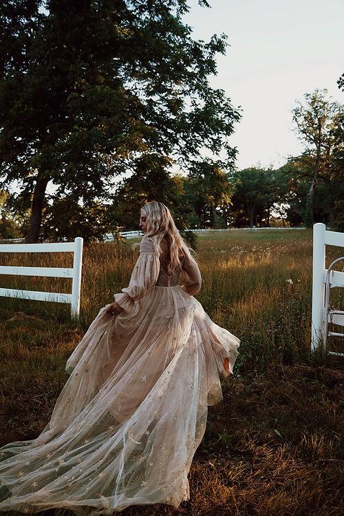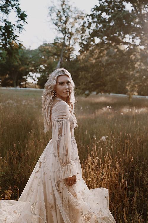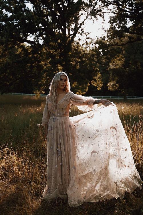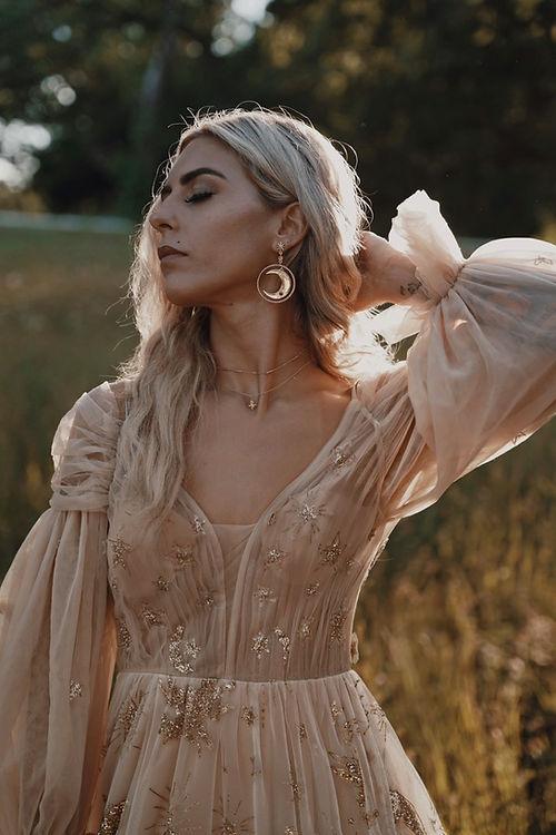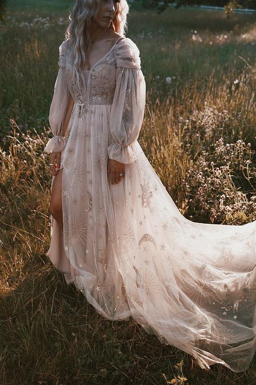 Elevate your wedding ensemble with our Golden Star Moon dress. Featuring a flattering V-neck and long sleeves, the champagne-colored fabric is adorned with beautiful gold stars and moons. The elegant train adds a touch of glamour to this stunning bridal gown.